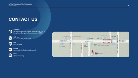 Srinagarindra Rd.Kanchanaphisek Road (Outer Ring Rd.)Go to Bang KapiGo to Ram 2 CampusGo to Pak NamSoi Wat Khlong Plad PriangSoi Mittraphap Bangna-Trad 62Central BangnaNovotel BangkokInterlink TowerToyota ShowroomBangnaTowerPrinc Hospital SuvarnabhumiGas stationShellAng Sila SeafoodTesco LotusBITEC BangnaMEGA BangnaU-TurnCONTACT USAddress:46 Moo 12 Soi Mittraphap, Bangna-Trad Km. 6, Bangkaew, Bangplee, Samutprakarn,10540Call us: 02-312-0234-6, 02-312-0884-5Fax:02-312-0886e-mail:center-admin@btipackaging.co.thLine:@btipackagingCOMPANY PROFILE10BOTTLE THAI INDUSTRY PACKAGING