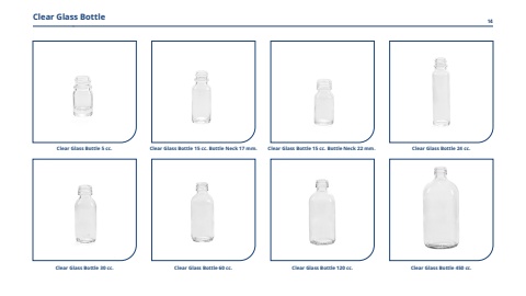 Clear Glass Bottle 30 cc.Clear Glass Bottle 5 cc.Clear Glass Bottle 15 cc. Bottle Neck 17 mm.Clear Glass Bottle 15 cc. Bottle Neck 22 mm.Clear Glass Bottle 24 cc.Clear Glass Bottle 60 cc.Clear Glass Bottle 120 cc.Clear Glass Bottle 450 cc.Clear Glass Bottle14