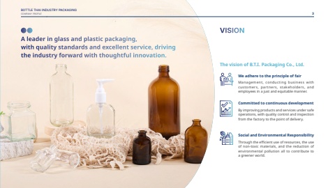 BOTTLE THAI INDUSTRY PACKAGINGCOMPANY PROFILEVISIONThe vision of B.T.I. Packaging Co., Ltd.We adhere to the principle of fairManagement, conducting business with customers, partners, stakeholders, and employees in a just and equitable manner.Committed to continuous developmentBy improving products and services under safe operations, with quality control and inspection from the factory to the point of delivery.Social and Environmental ResponsibilityThrough the efficient use of resources, the use of non-toxic materials, and the reduction of environmental pollution all to contribute to a greener world.A leader in glass and plastic packaging, with quality standards and excellent service, driving the industry forward with thoughtful innovation.3