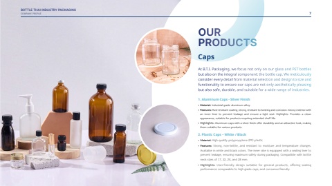BOTTLE THAI INDUSTRY PACKAGINGCOMPANY PROFILECapsAt B.T.I. Packaging, we focus not only on our glass and PET bottles but also on the integral component: the bottle cap. We meticulouslyconsider every detail from material selection and design to size and functionality to ensure our caps are not only aesthetically pleasing but also safe, durable, and suitable for a wide range of industries.1. Aluminum Caps - Silver Finish%u2022Material: Industrial-grade aluminum alloy%u2022Features: Rust-resistant coating, strong, resistant to twisting and corrosion. Glossy exterior with an inner liner to prevent leakage and ensure a tight seal. Highlights: Provides a clean appearance, suitable for products requiring extended shelf life.%u2022Highlights: Aluminum caps with a silver finish offer durability and an attractive look, making them suitable for various products.2. Plastic Caps %u2013 White / Black%u2022Material:High-quality polypropylene (PP) plastic%u2022Features:Strong, non-brittle, and resistant to moisture and temperature changes. Available in white and black colors. The inner side is equipped with a sealing liner to prevent leakage, ensuring maximum safety during packaging. Compatible with bottle neck sizes of 17, 22, 24, and 28 mm.%u2022Highlights: User-friendly design suitable for general products, offering sealing performance comparable to high-grade caps, and consumer-friendly.OUR PRODUCTS7
